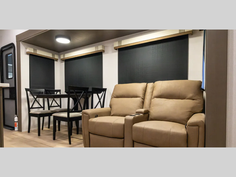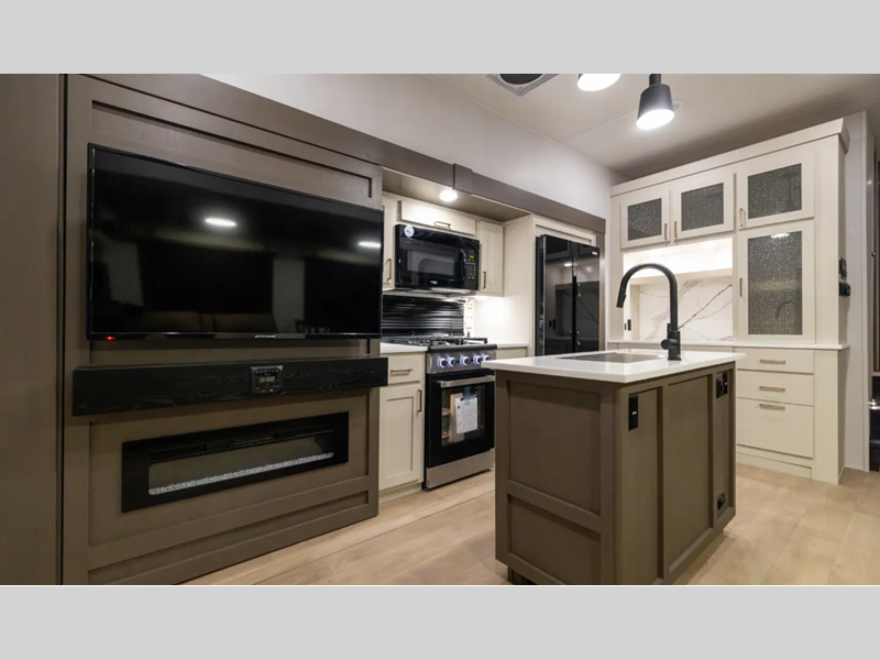 Sleeps 4 Slides 3 Length 40 ft 10 in Ext Width 8 ft Ext Height 13 ft 3 in Hitch Weight 2120 lbs Dry Weight 12619 lbs Cargo Capacity 3501 lbs Fresh Water Capacity 64 gals Grey Water Capacity 108 gals Black Water Capacity 44 gals Furnace BTU 35000 btu Available Beds King Refrigerator Type 12V Refrigerator Size 16 cu ft Cooktop Burners 4 Number of Awnings 2 LP Tank Capacity 30 lbs Water Heater Type On Demand Tankless AC BTU 27000 btu TV Info LR 65" TV Awning Info 14' and 18' Power w/LED Lights Axle Count 2 Washer/Dryer Available Yes Number of LP Tanks 2 Shower Type Standard Electrical Service 50 amp Similar Floorplans