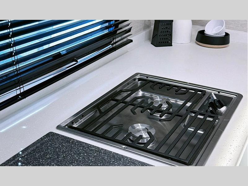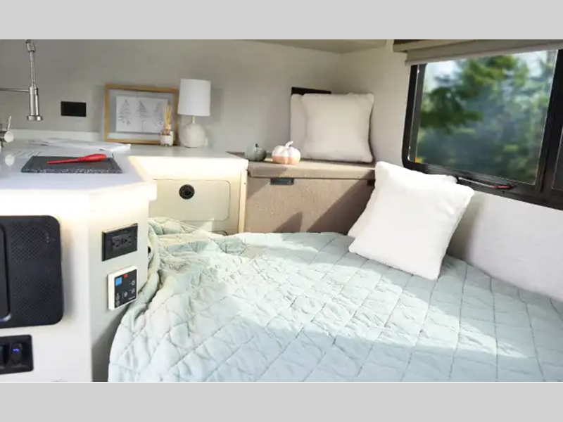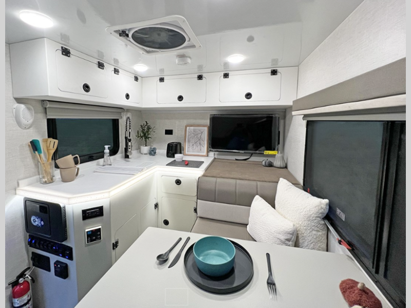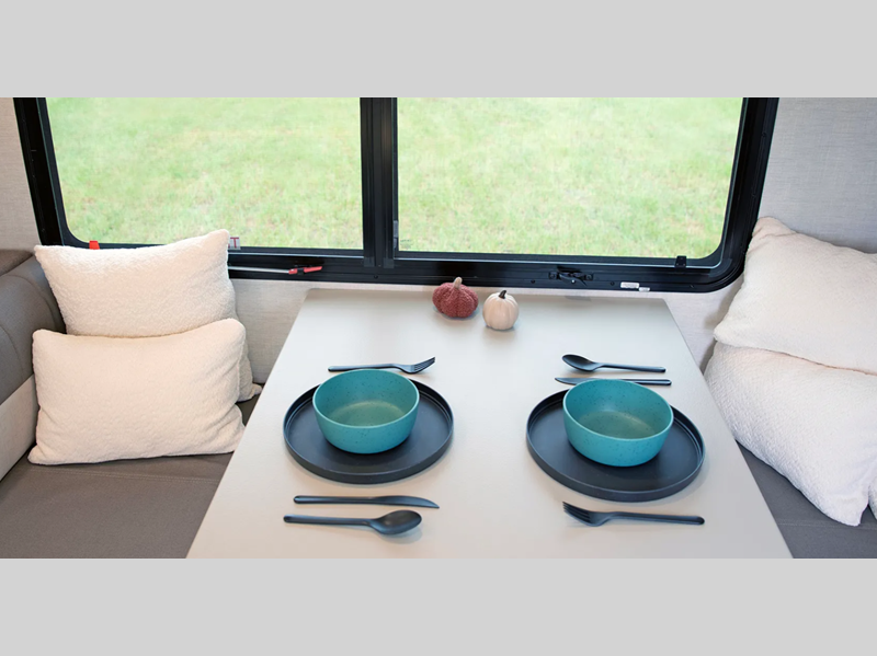 The one-piece Luxe vinyl flooring and aluminum cabinetry will be easy to clean, and there are sleek solid surface countertops. You will also find Tweed interior walls with Azdel, USB charging ports to keep your phone charged, plus an on-demand water heater for added comfort!