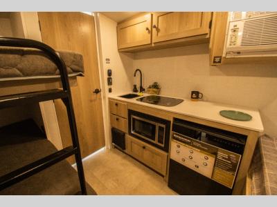 Perfect for couples, families, or friends, this trailer offers a comfortable and functional space to relax, recharge, and explore. The full bathroom is a serene retreat, equipped with everything you need to refresh and rejuvenate after a day of adventure. The two bunk beds give a snug and inviting sleeping spot, perfect for kids or adults looking for a cozy spot to rest. The kitchen is equipped with a microwave for quick and easy meal prep, and a refrigerator to keep your favorite snacks and drinks fresh. Overhead cabinets provide plenty of storage for your gear, cookware, and essentials, keeping your trailer tidy and organized. The bed offers a restful sleeping space, perfect for unwinding after a long day of exploring.