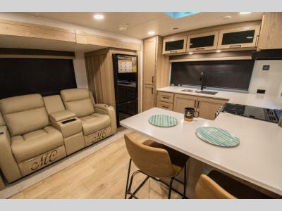 This travel trailer is the best option for you and your partner! The lavish full rear bathroom features a spacious layout and a convenient linen closet, perfect for relaxation and refreshment. The elegant bedroom boasts a plush queen bed, ample wardrobe space, and stylish dresser, creating a serene retreat. The spacious living room and kitchen combined area is the heart of the trailer, featuring plush theater seating for cozy movie nights, a generous closet for storing essentials, and a 12V Smart TV for entertainment on the go. Plus, the expansive countertop with chairs provides a perfect spot for gourmet meals or socializing, while the premium three-burner cooktop, well-stocked kitchen pantry, and high-performance microwave make meal prep and cooking a true delight.