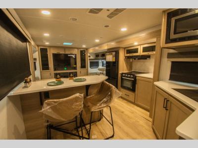 If you've been searching for a full-featured travel trailer, this is the one! Not only will you enjoy your own space up front in the master bedroom, but your guests can claim the rear bunkhouse suite all to themselves. There are two bunks with storage here, along with a desk, and a half bath for convenience. Your crew can meet in the middle living area on the theater seat or booth dinette. There is also a TV here for movie nights! Or gather around outside to enjoy the sunrise or sunset under the 24'6" power awning. A full walk-thru bath is sure to come in handy after a day at the lake, and did we mention this unit has dual entry doors?!