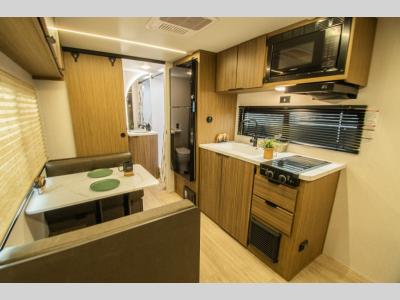 This travel trailer with a full rear bath and versatile sleeping space is your ticket to fun and adventure. While you're putting out the 12' power awning, you can grab the lawn chairs from the full pass-through storage. There is a two burner cooktop and a microwave oven to prepare your meals in, and a booth dinette to dine at. You'll love the RV queen Murphy bed to sleep on at night, and the sofa with storage to relax on during the day!