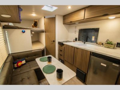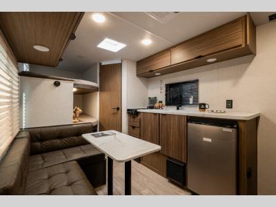 The double-size bunks with storage will be a big selling point in this travel trailer! While your guests take the bunks, you can have the front queen bed all to yourselves, and there is a wardrobe to keep your things organized. A two burner cooktop and microwave will let you make meals each day, and you can dine at the open lounge with a table.
